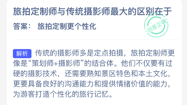 以上就是旅拍定制师与传统摄影师最大的区别在于?支付宝蚂蚁新村最新答案2025年12月5日,更多精彩内容,请点击关注更新!