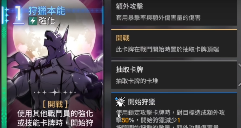 一旦触发他的主动和被动技能后,将会以极高的频率对锁定的目标实施展开公鸡多个技能在使用时都能够造成额外的伤害。狩猎启动是它的核心被动效果,一旦进入到狩猎状态后,所有的敌人都不会是狼哥的对手。与雨果所组建的小队成员在单体攻击时可以拥有额外70%的对敌伤害。与队友之间的联动效果是非常完美的,可以作为一个极具攻击性的卡牌角色进行培养。
