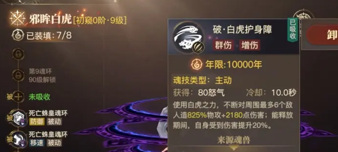 第二魂技白虎烈光波,就可以打乱敌方节奏,在短暂蓄力之后,技能会朝着前方直线释放攻击。不仅可以给6个敌人造成高额物理性伤害,还会有致盲的效果。敌人被致盲之后,就会导致命中效率大幅度的下降,可以减少一方承受的伤害,也可以给队友创造出更多的输出空间。第三魂技白虎金刚变,是双形态的机制,直接决定邪眸白虎的战术定位。切换到防御形态时,自身的抗伤能力就会提升,会成为敌方集火的目标,承担前排的肉盾职业。