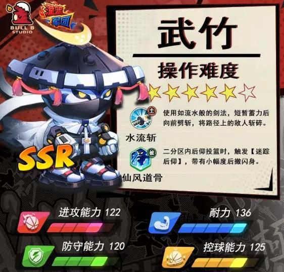 武竹在游戏里的表现会比较优秀,利用主动技能可以向敌人劈砍,一旦路径上有对手,那都可以直接用这项技能清除对方,对方如果已经拿到篮球的话,那还可以强制掉落,这项技能不只有一定的进攻能力,还会有防守能力,非常适合在对战的过程中通过灵活操作发挥角色的特性,除此之外,角色还会有一项被动技能,在投篮之后还会转身,这个动作能提升投篮的命中率,顺利投篮之后,玩家还可以会增强的体力。