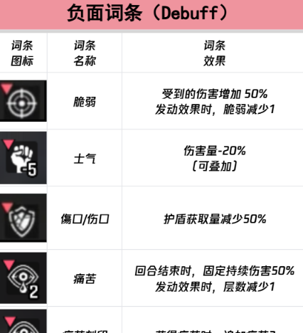 抑制输出类型的负面词条也是控制敌方伤害输出的一大关键点,其中负面类型的是其词条,可以通过降低伤害造成效率来发挥战斗作用,效果可以通过叠加进行增强,且叠加规则与正面的士气词条是一致的,区别在于负面时期的特性是,回合结束后会自动清除所有叠加的层数,这意味着这一局的影响只能限于当前回合,玩家需要在词条生效的回合内,通过净化技能或者规避敌方攻击的方式来减少自身团队的输出损失,另一个词条削弱同样以降低伤害为核心,但是层数的消耗会更加的少量,大家可以结合着使用。