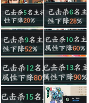 击杀14-17个敌将,每击杀一个敌将掉自身属性2%。