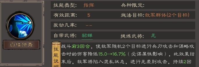 三国乱世霸王貂蝉技能怎么样,貂蝉核心价值来自自带技能“白楼独舞”:战斗前3回合降低敌军2目标的兵刃/谋略伤害(受自身谋属性加成),后续还能附加2回合混乱效果,兼具减伤与控制,是前中期阵容的优质辅助选择。