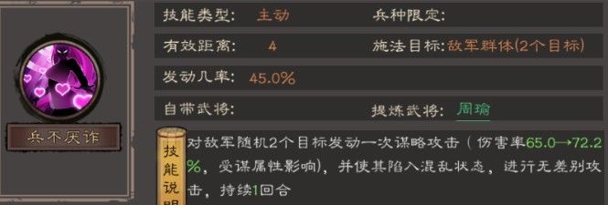 效果:对敌军2目标发动谋攻(伤害受谋属性影响),并使其陷入缴械(无法普攻),持续1回合