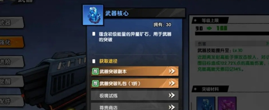 关于武器提升,首先是强化部分,玩家可以通过“极境试炼“和”武器强化副本“获取武器强化所需的能量包和突破材料,也可以在尊贵商店每天换取一些材料(副本每天都可以刷2次,无需体力,可不要忘了)。