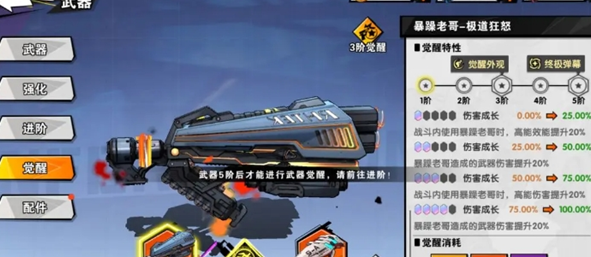 然后是武器觉醒,觉醒后的武器将获得新形态和特性(只有UR及以上的武器才可觉醒),达到5阶后可进行觉醒,