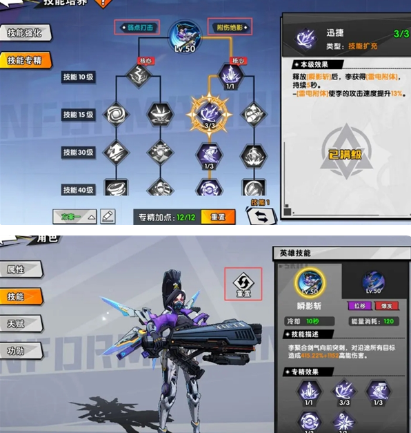 技能专精通常有两条不同特性的分支,专精加点可以随时重置。
