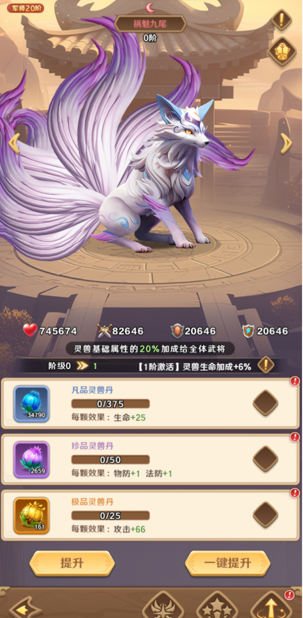 祸魅九尾:他其实要注重养成的策略性,并且还需要注意时机,他在竞技场当中能够发挥着重要的作用,毕竟在战斗的时候,它能够使敌人全体武将每回合将会减少。怒气值,额外他其实还能够具备控制的作用,能够直接打断敌人的核心武将的节奏感。所以说有它的存在,能够让整个队伍的输出创造更加合理的条件,而玩家在获取它的时候,是在开服12天之后就能够解锁灵兽系统,接下来通过抽取获得之后就能够进行使用。