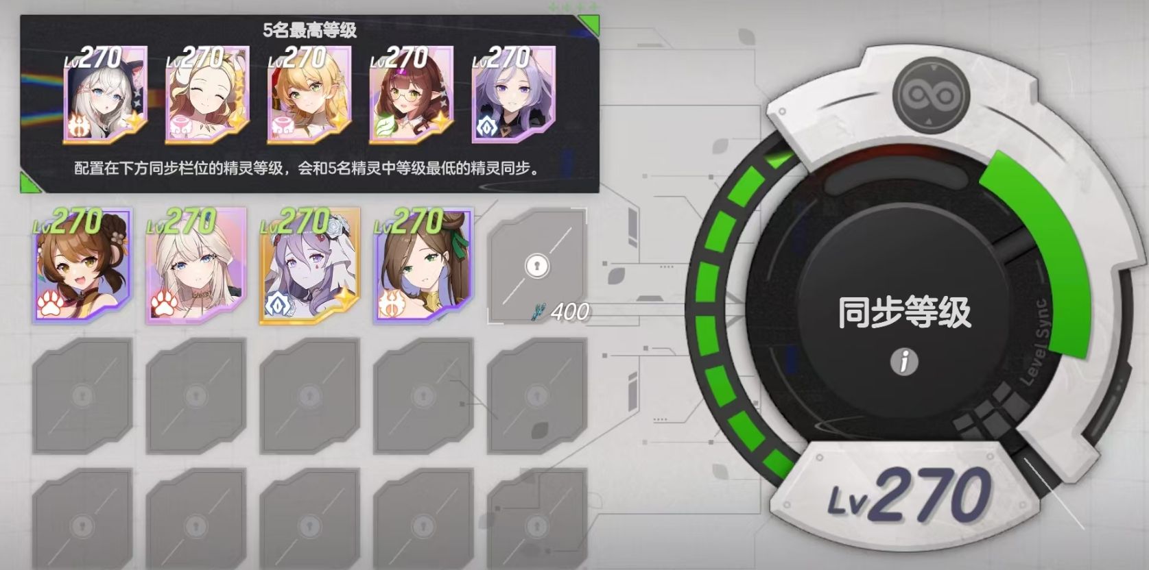 召唤劵能让玩家们从卡池里抽取到多位风格各异的精灵少女,她们都可通过养成来提高战力,并且游戏开放了同步等级功能,玩家只需放置五名等级最高的精灵少女,然后将需要升级的精灵放到同步栏位,游戏会立刻让该精灵的等级与五名放置精灵少女同步。但要注意,同步时最高能提升的等级会以五名放置精灵中等级最低的为基准,因此玩家最好让五名精灵少女都保持同一等级。