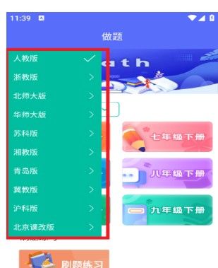 初中数学助手app怎么更改教程,用户在本站下载安装好软件,点击手机桌面图标,打开app,进入首页看到默认的是人教版,点击一下,点击你要的版本就行了。