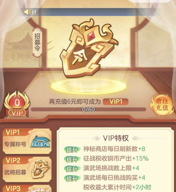 为了能让玩家有更多的选择,里面会有新手成长活动,只要是新手玩家就能参与全新登陆礼包,在这个利益包中,能获得很多初期的资源,另外还会有招募令充值玩法,玩家可以充通过充值6元提升自己的VIP等级,等级变高之后,除了获得专属的称号之外,还有机会招募更多强力的名将或者是,让自己每天的经验产出以及各种铜币产出都能得到提升。