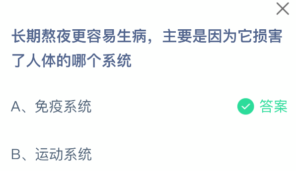 以上就是长期熬夜更容易生病,主要是因为它损害了人体的哪个系统,支付宝蚂蚁庄园2025年12月11日答案最新,更多精彩内容,请点击关注更新!