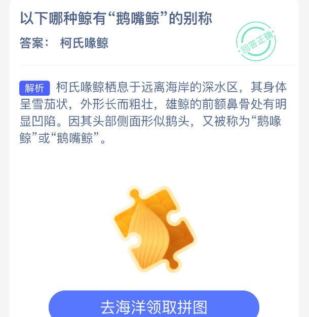 以上就是以下哪种鲸有“鹅嘴鲸”的别称?神奇海洋今天答案最新2025年12月10日分享,更多相关攻略内容,请点击关注更新!
