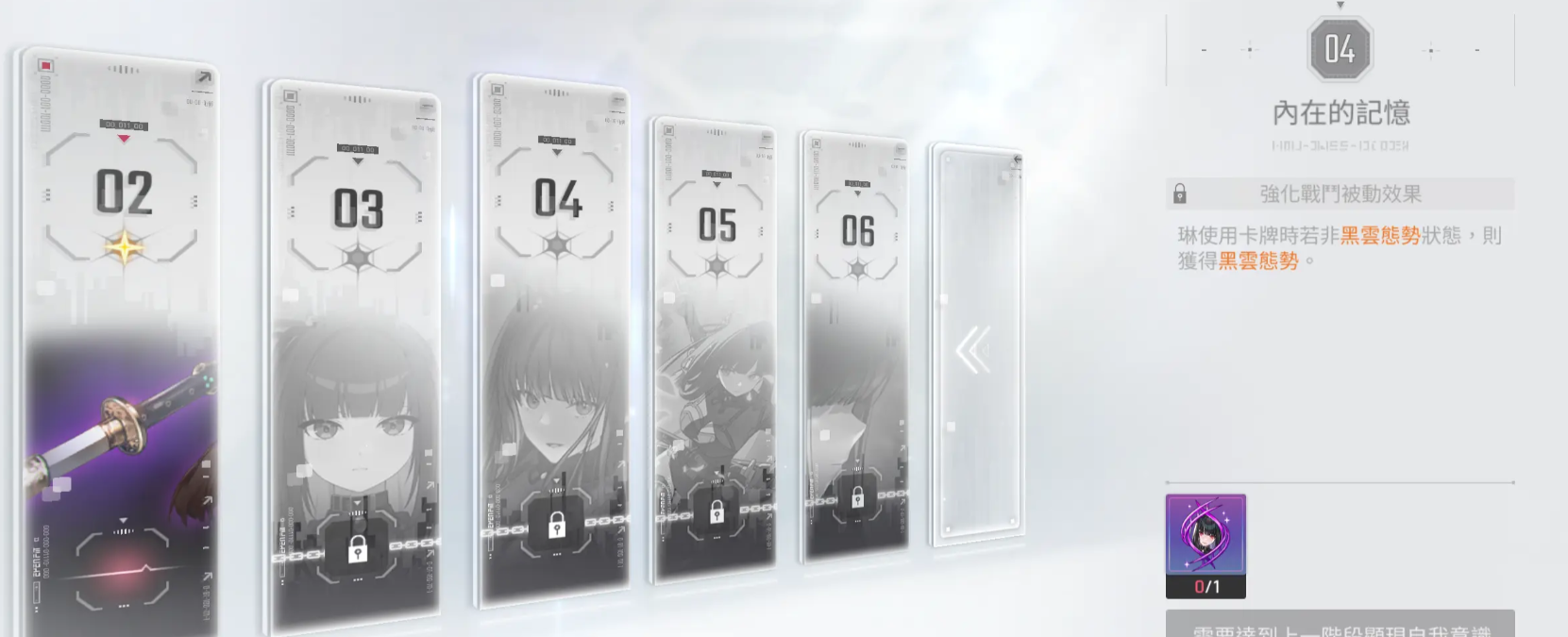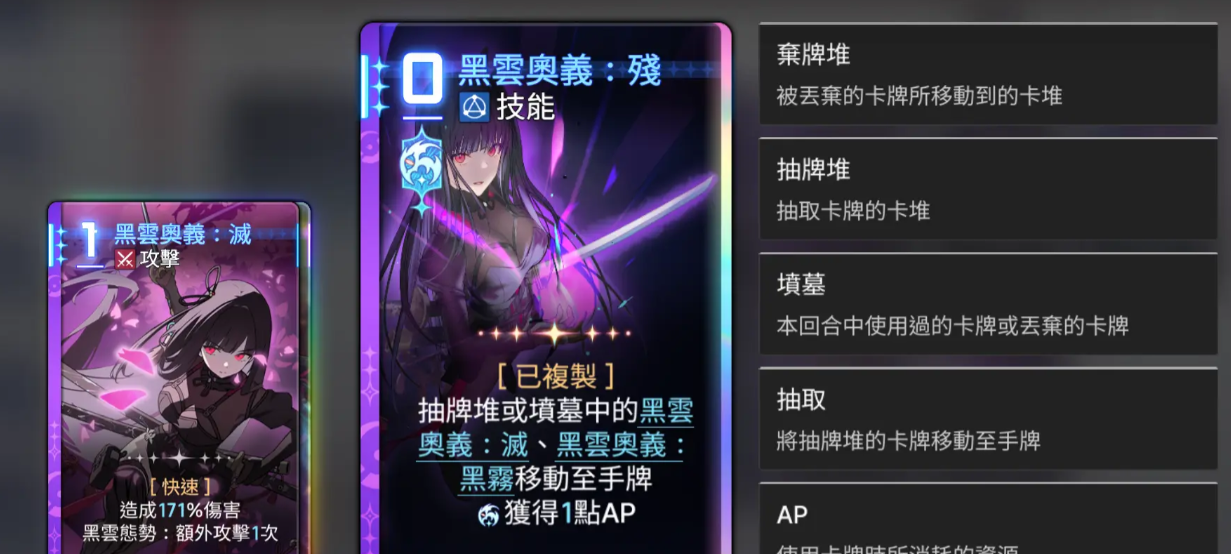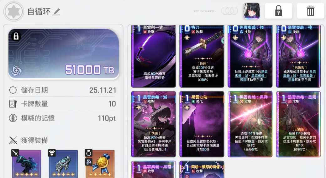 低命座当中琳的控牌顺序也会有所提升,如果是高命座的话,其实在这里选择琳的卡牌主要是选择一个被动黑云的效果,这样的话让她在能力上面能够达到的卡牌组合会更加稳定一些,后期如果是在复制卡上面优先级是最高的是残这张卡,然后是屁股斩以及灭,还有拔刀,其中残的话只会移动一张,那么总结整体的卡组效果当中,大家就要注意她的各个卡牌可以带来足够的神闪机制,所以琳在有这样加成效果上面的话,带来的能力其实是比较有优势可言的,后期在装备的时候,大家也要注意琳自身的循环,基本都是一些0费的卡牌。