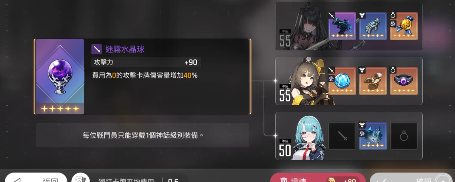 包括其中2命的入鞘最后丢出去的话也是0费的,所以在这里琳要搭配武器的话,大家可以带水晶球,因为水晶球是目前0费的卡组当中含金量最高的一个搭配,也不是梅铃这个角色主要的一个专属武器,放在这里的话,琳进行装备的时候要注意,前期如果已经有紫色的装备的话,是无法进行更换的,所以要搭配水晶球给琳的话,一定要提前留下一个转手的位置,如果是防御道具上面大家可以为琳搭配的是自由之翼,这样的防具给琳带来的一个加伤效果是比较符合整体的能力。