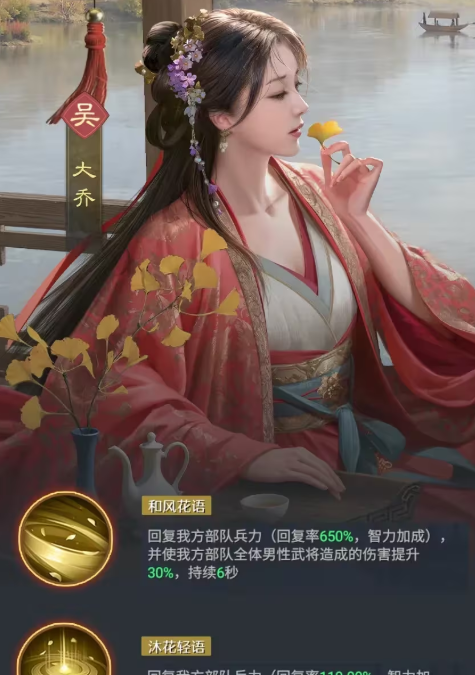 那么这里大乔上场的时候,她自身作为主将的情况下,可以给全体的队友都带来一个兵力数值高达650%数值的恢复效果,在兵力恢复上面就可以保证大家在整体数值上面不会受到敌人的影响,而且她可以给队内所有的男性武将带来一个30%的伤害提升数值,这个伤害提升数值只要生效的话,就会带来6秒的时间,所以在自带技能效果的时候,大乔其实除了这样一个单位恢复的能力之外,她的这个持续带来的承伤数值上面也会有5%的数值提升,所以这类效果在前期大家进行搭配的时候,大家可以走吴国对当中的一些阵容,激发能力强化大乔的表现。