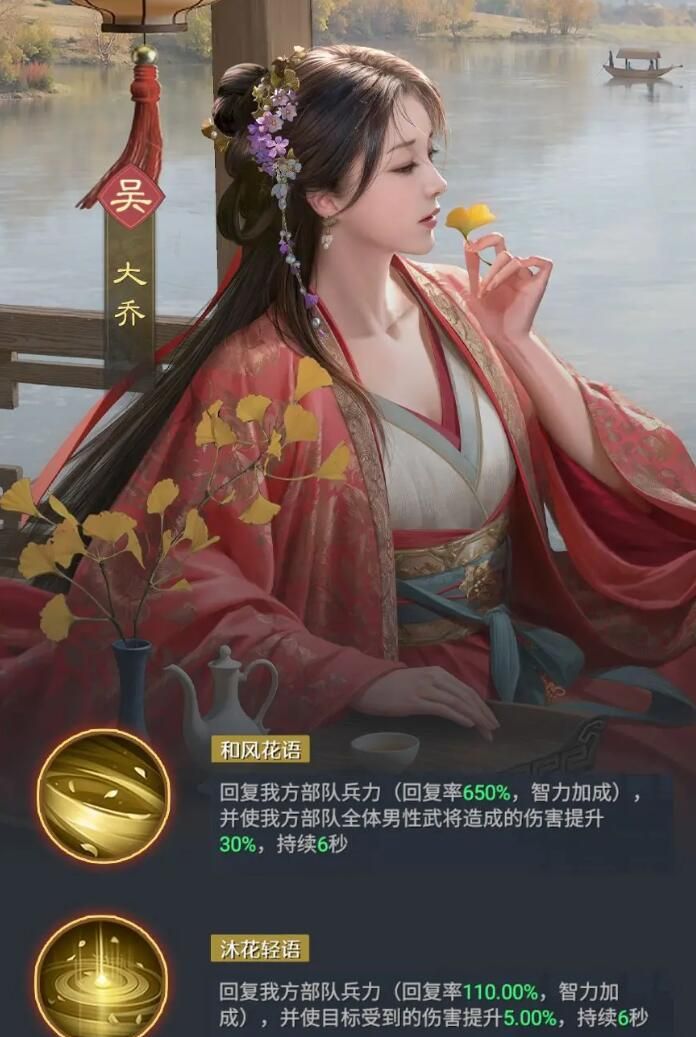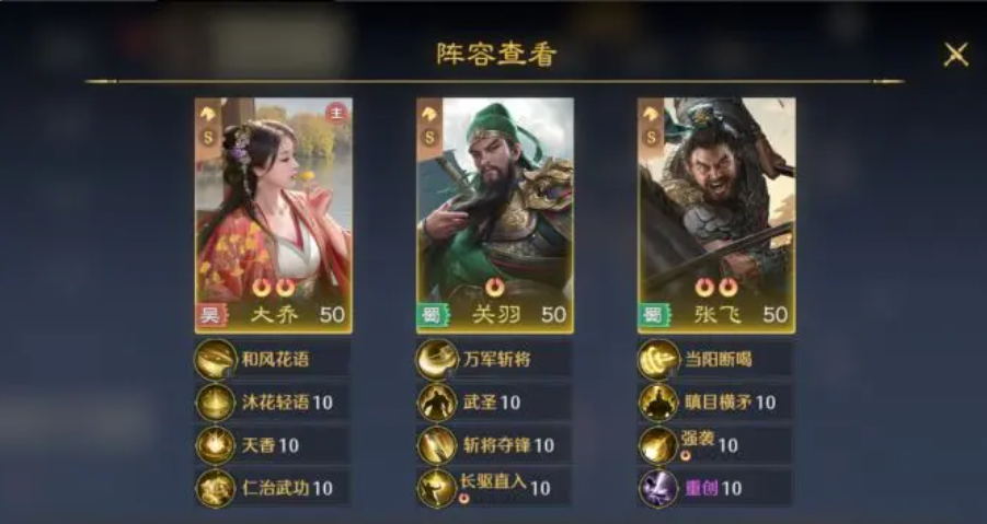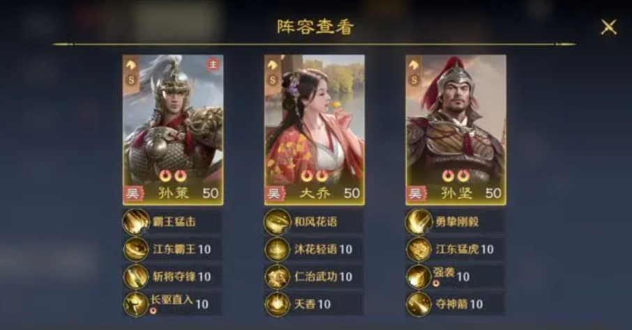 玩家在选择给大乔搭建阵容的时候,需要了解大乔作为核心的辅助。它能够集治疗和增伤的功能于一体。另外,在施展怒气技能的时候,还可以给整个队伍当中的男性提供30%的输出加成。所以说大乔的实力也是比较厉害的。在搭建阵容时,可以先形成东吴铁三角的阵容,不得不说这个阵容获取的成本特别的低,并且能够快速的成型。在开荒时期以及游戏中期的时候,玩家可以利用这个阵容来进行过渡。要说东吴铁三角,分别有大乔,孙策,孙坚。