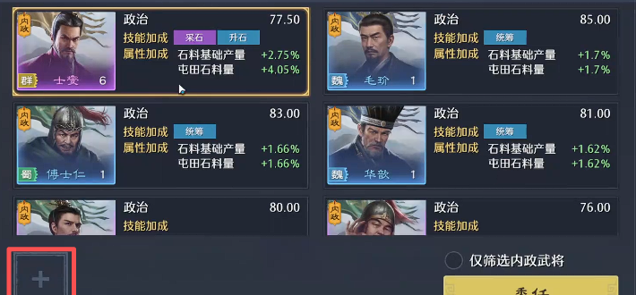 然后还有一个方法,多加的产量可以因为前期的战法而变得更多,战法点会返给武将,其中的这个预备兵也会免费的返给大家,那么大家就可以直接把这个内政官把它给下了,然后带着他去升级,带着他去升级之后的成果需要看状态,一般在10级的时候,效果是不错的,升到10级之后加10点政治,采石官这个囤点量可以增加,他最终的一个效果就会升级到4400左右的数值,那4400的一个采石量的话,然后就比如说大家前期可能是基本上每次都是要囤石头的,这里基本如果囤个五次,那可能2000多的差距就是1万了,反正就是大家这里屯田的次数越多,它的差距跟其他玩家的差距可能就越来越大了。