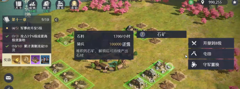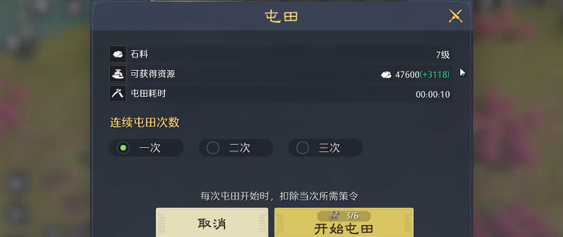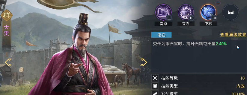 前期其实在石头类,或者各种粮草资源是很缺的,那大家可能跟前面开荒开的快的玩家相比就是差在了主线任务的速度上,那过主线任务可能就是卡石头,或者卡个粮草都是有可能的,这里小编给大家分享一个能多拿屯田的方式,大概每次都能多四五天的产量,大家想要用这个方法的话,首先要知道这个游戏当中是内政官的,内政当中有采石官,那大家就可以把这个采石官的内政给点上,同一个田的产量都会有很多的增加量,比如大家囤一次就是1928,大家通过内政官把他的这个技能全给点满,然后在产出上面就会有1000多的差别,那么大家此时还可以做一个操作,就是在屯田的时候,就把这个技能给它点满,然后比如说不点了,就是大家拿到想要的资源了,再把之前给内政官用的升级资源给收起来。