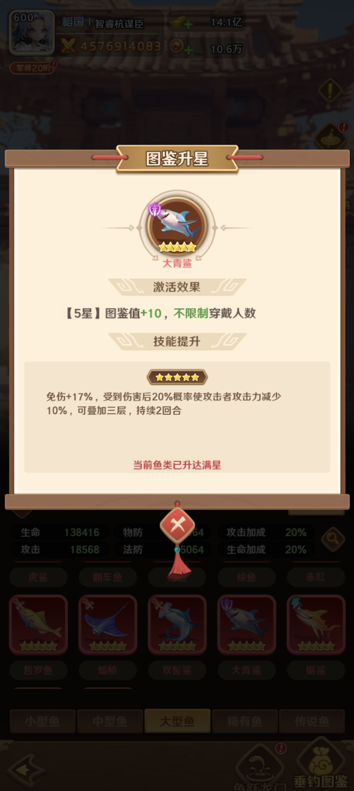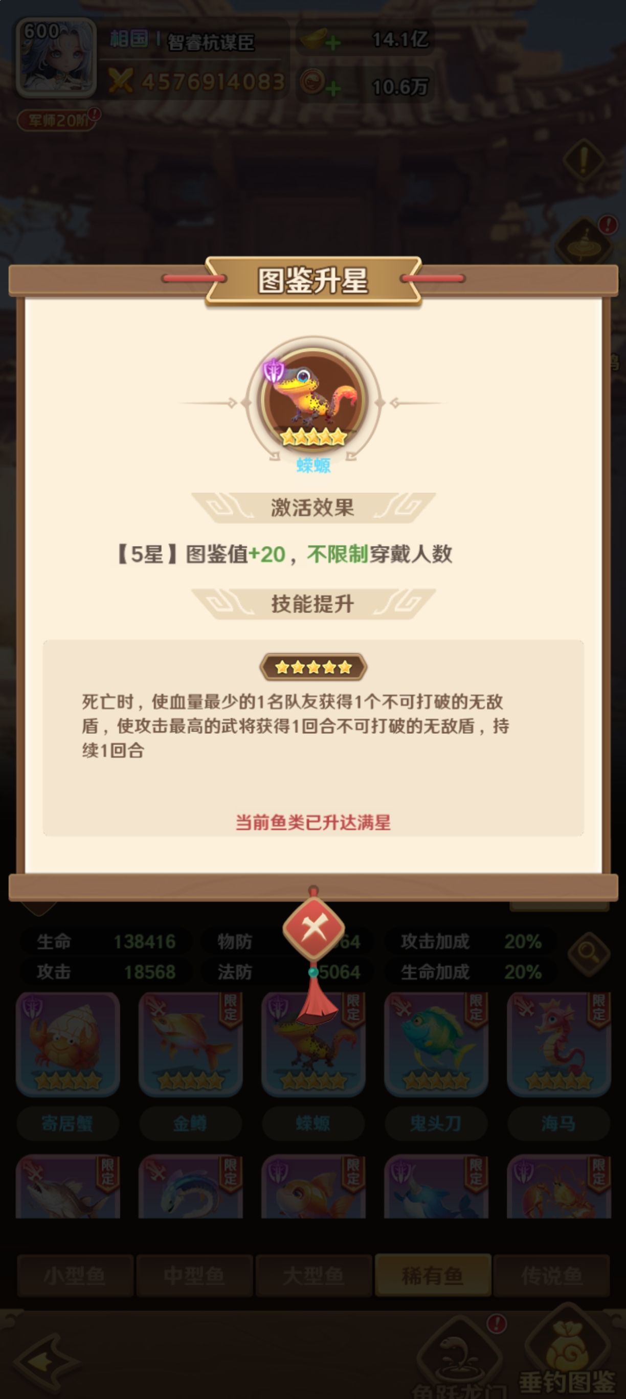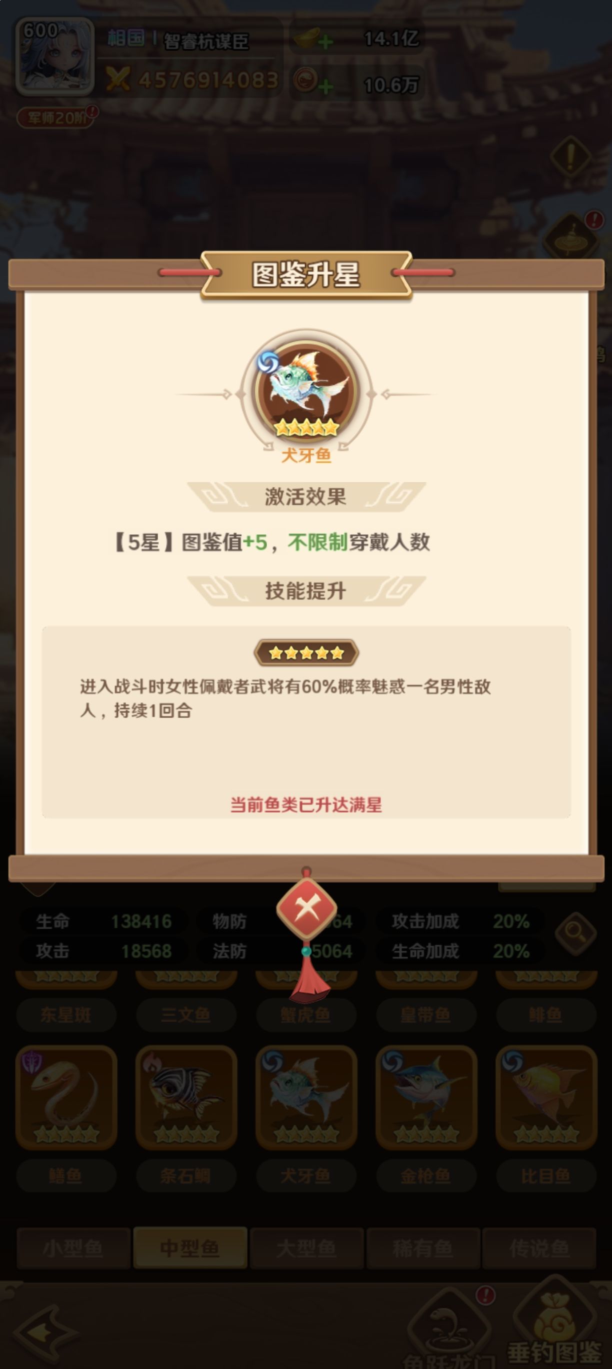 在巨神军师游戏当中,鱼作为特殊的装备类型,目前分为多个类型。而对于貂蝉来说,他如果要跟鱼进行搭配的话,主要就是为了能够更好的提升他的魅惑控制能力,以及生存能力。在这里,首先建议大家直接选择犬牙鱼,因为它在激活之后就能够提供图鉴值加5的效果,并且不限制穿戴的人数。要是貂蝉直接佩戴了这个鱼类之后,他的魅惑技能将会提升,所以貂蝉的控制能力将会提高,在战场上的实力也就会更强。