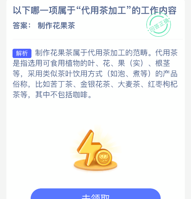 以上就是以下哪一项属于“代用茶加工”的工作内容?支付宝蚂蚁新村最新答案2025年12月11日,更多精彩内容,请点击关注更新!