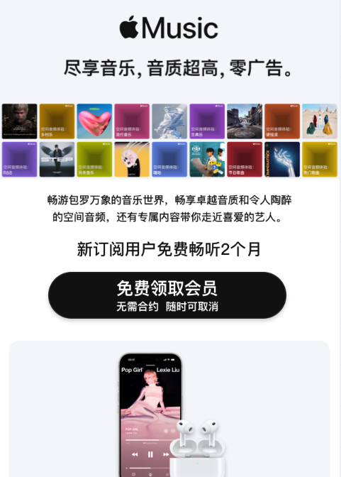apple music怎么领取免费会员?苹果音乐是苹果公司开发的一款强力音乐播放器应用,凭借其丰富的曲库、独特的收费模式、出色的音质以及强大的功能,让你随时随地都能收听到全世界最顶尖、最热门、最好听的歌曲,下面给大家带来了apple music会员免费领取入口分享!