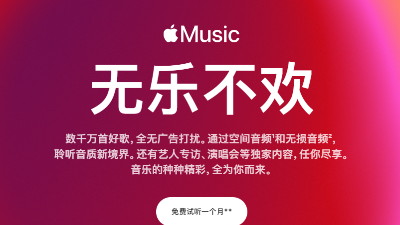 优惠活动仅向中国大陆AppleMusic用户提供。AppleMusic需要订阅。用户需持有效Apple账户且已登记付款方式。适用条款和Apple隐私政策,请见https://www.apple.com.cn/legal/internet-services/itunes/cn/terms.html