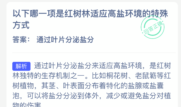 以下哪一项是红树林适应高盐环境的特殊方式?【神奇海洋】12月14日新题目已开答!正确答案现已公布,点击领取拼图,一起为修复海洋生态贡献力量!今日正确答案是:【通过叶片分泌盐分】。通过叶片分泌盐分来适应高盐环境,是红树林独特的生存机制之一。