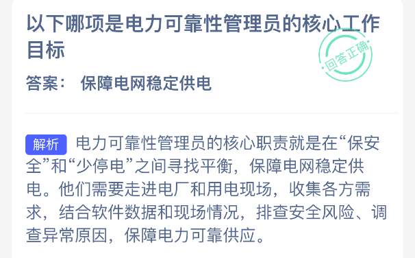 以上就是以下哪项是电力可靠性管理员的核心工作目标?支付宝蚂蚁新村最新答案2025年12月16日,更多精彩内容,请点击关注更新!