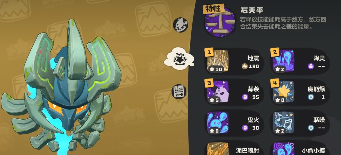 巨灵石一共有三个技能可以使用。第一个技能叫扔泥巴,这是个单体攻击招式,伤害倍率能达到120%,打起来还算疼。第二个技能是超声波,这个技能比较特殊,它属于范围攻击,可以同时打到多个敌人,虽然单个目标的伤害只有70%,但是胜在能群攻,而且还自带穿透效果,打那些防御高的敌人特别好用。第三个技能烟雾弥散就更厉害了,这是巨灵石的大招,释放的时候巨灵石会进入霸体状态,不会被打断,被这招命中的敌人会陷入失明,失明期间啥技能都放不出来,相当于暂时失去战斗能力。