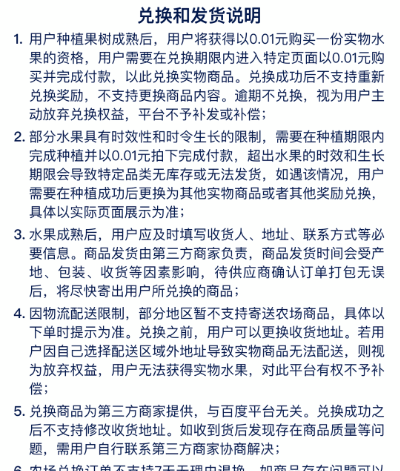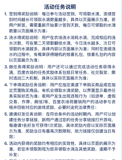 3.用户种植果树后可通过做任务获得水滴奖励,详见活动任务说明;种植过程中,用户也可以参与领取水滴等活动任务,具体奖励数量以页面展示为准;百度农场会随着活动的进行更新不同的活动任务和玩法,具体活动任务内容和奖励以呈现在页面的展示为准。