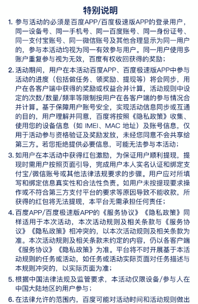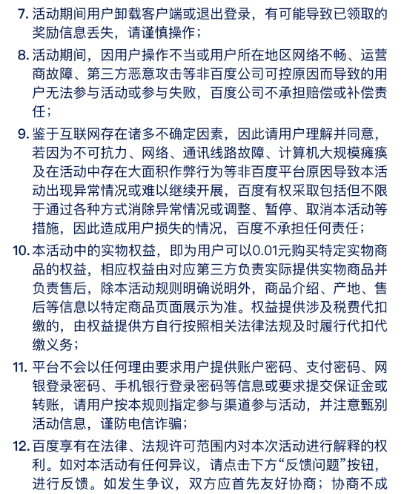 2.因存在违反百度平台规则而被封禁尚未解除封禁的用户、账号存在异常情况的用户,不可参与本活动。若用户对封禁有异议,可进行申诉,申诉结果以客服反馈为准。