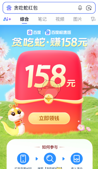 2、或者下载百度APP或者百度极速版APP,通过百度APP-搜索【贪吃蛇红包】同样可以进入活动。