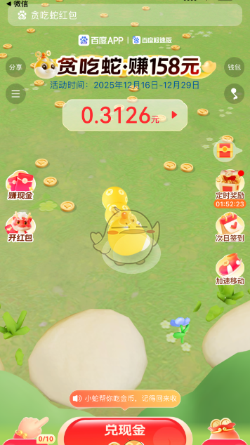 百度贪吃蛇红包活动攻略:活动时间为12月16日至12月29日,用户需登录百度APP参与。通过完成任务(如签到、搜索、答题、邀请好友)积累金币,金币可兑换现金。奖励达到门槛后可提现至微信或支付宝,每日档位有限,请及时操作。