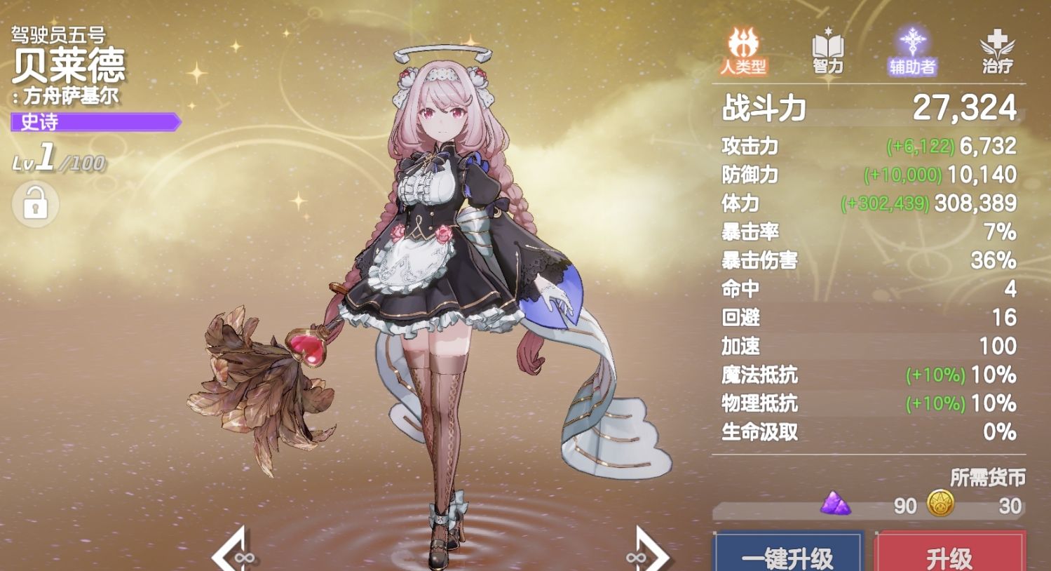 强悍的加双暴能力也令贝莱德成为了玩家在新手无限十连池里最佳的选择,而且她会指定向己方攻击力最高的角色释放,因此能将双暴增益百分百加到主C身上,再加上双暴又是所有主C非常需要的属性,也令贝莱德能与所有主C搭配作战。而且游戏又会在加速成长任务里送给玩家四个角色自选箱,玩家只需在里边选择达芙妮(前排)、梅菲斯托佩莱斯(法伤大C)、乙叶(收割)、梅尔菲斯(召唤C),就能组成一套很完整的开荒队来对应前期的战斗。