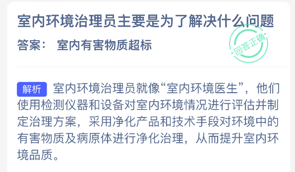室内环境治理员主要是为了解决什么问题?【蚂蚁新村每日一题】2025年12月18日题目已发布!坚持答题,积累木兰币,即可加速小镇建设。答对本题,立即可享“产速+3/时”的加速奖励!今天正确答案是【室内有害物质超标】。室内环境治理员主要致力于解决室内环境中存在的各种污染问题和健康风险,以创造安全、健康、舒适的居住和工作空间。他们的工作核心是识别、评估并消除或控制室内环境中的有害因素。