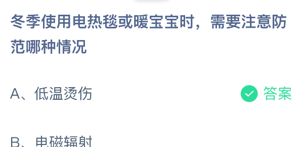 以上就是冬季使用电热毯或暖宝宝时,需要注意防范哪种情况,支付宝蚂蚁庄园2025年12月20答案最新,更多精彩内容,请点击关注更新!