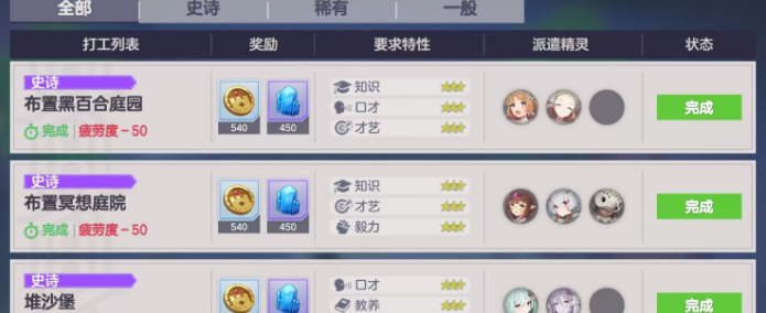 任务类型:分为史诗(最优)、稀有、一般三级,单次任务消耗疲劳值相同。