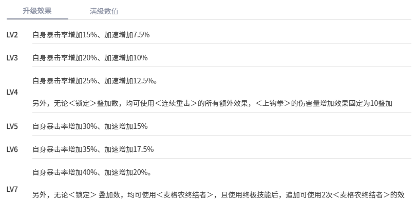 等级2:<锁定>每1叠加增加的数值变更为1.5%(等级21解锁)