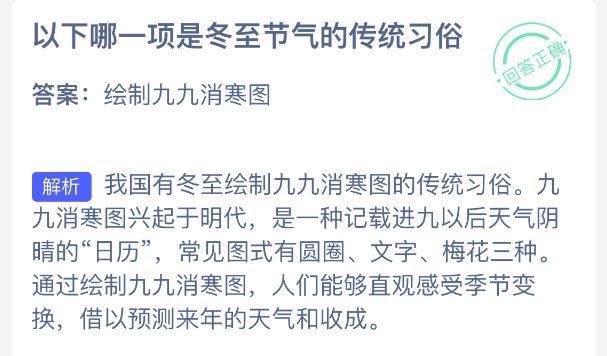 以下哪一项是冬至节气的传统习俗?支付宝小鸡课堂开课啦!每天花一分钟答题赚饲料,喂喂小鸡就能贡献爱心啦!轻松又意义十足!2025年12月21日蚂蚁庄园的小鸡课堂题目正确答案是【绘制九九消寒图】,绘制九九消寒图是冬至节气的传统习俗。九九消寒图是中国民间冬至后的习俗,常见形式包括:梅花图版、文字版、圆圈版。