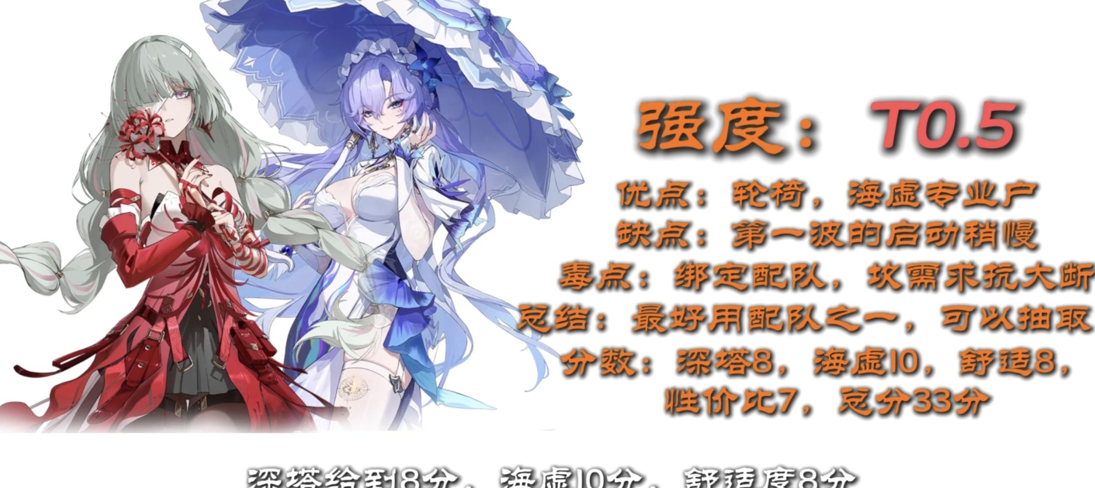 作为真正意义上属于2.0强度的第一个角色配队,不可否认的是在2.0全版本的前期是可以爽玩很多个版本的,但在即将进入3.0时代,这个角色是绝对不推荐抽取的。