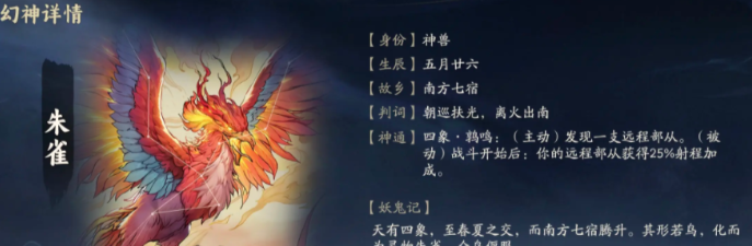 除了白虎之外,游戏里还会有很多幻神,每一个的能力也会各有区别,朱雀是非常适合远程对抗的,很多新手玩家初期能力不足,这个时候不想和对方保持太近的距离,可以选择利用朱雀在游戏里开启远程对抗,另外就是一旦这个幻神加入到阵营,那整个场上的远程角色射程都能提升25%,在这种设定下,角色可能都没有靠近玩家,就会直接遭到迎头痛击,和白虎一样,都是非常适合新手去选择的幻神,如果感觉自己战斗能力不足的话,那就可以尝试使用朱雀。