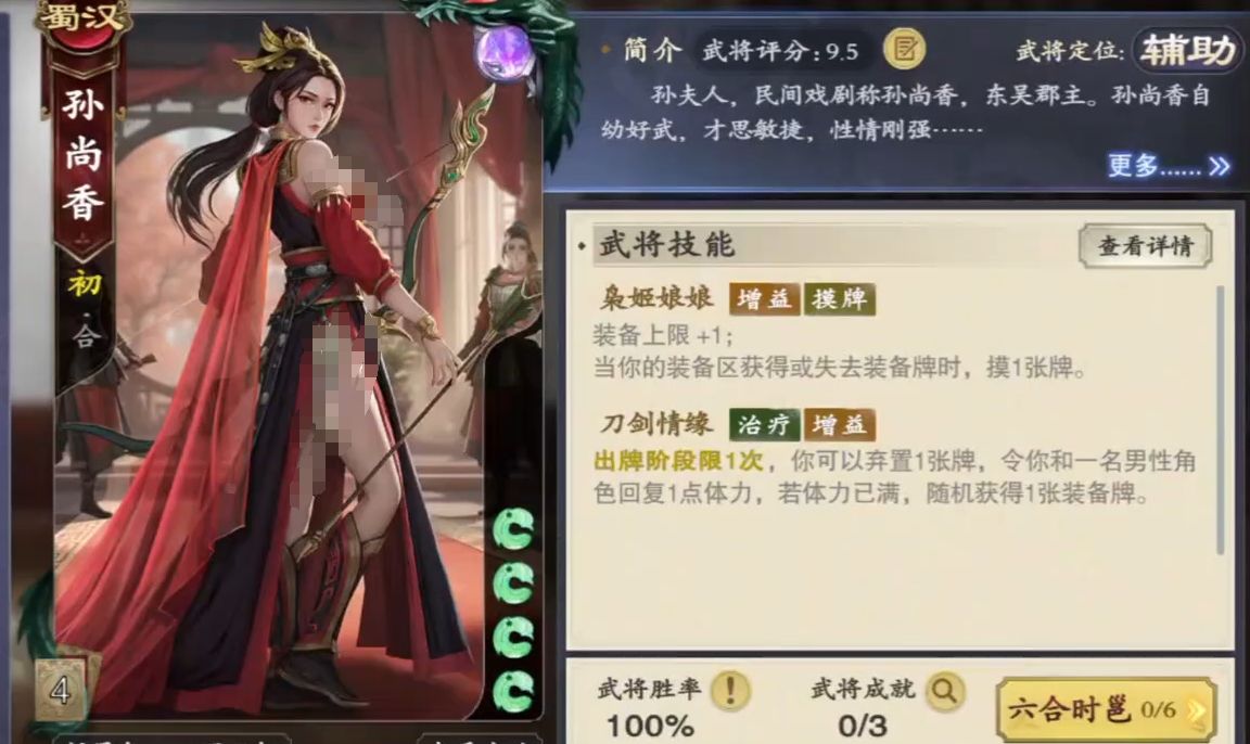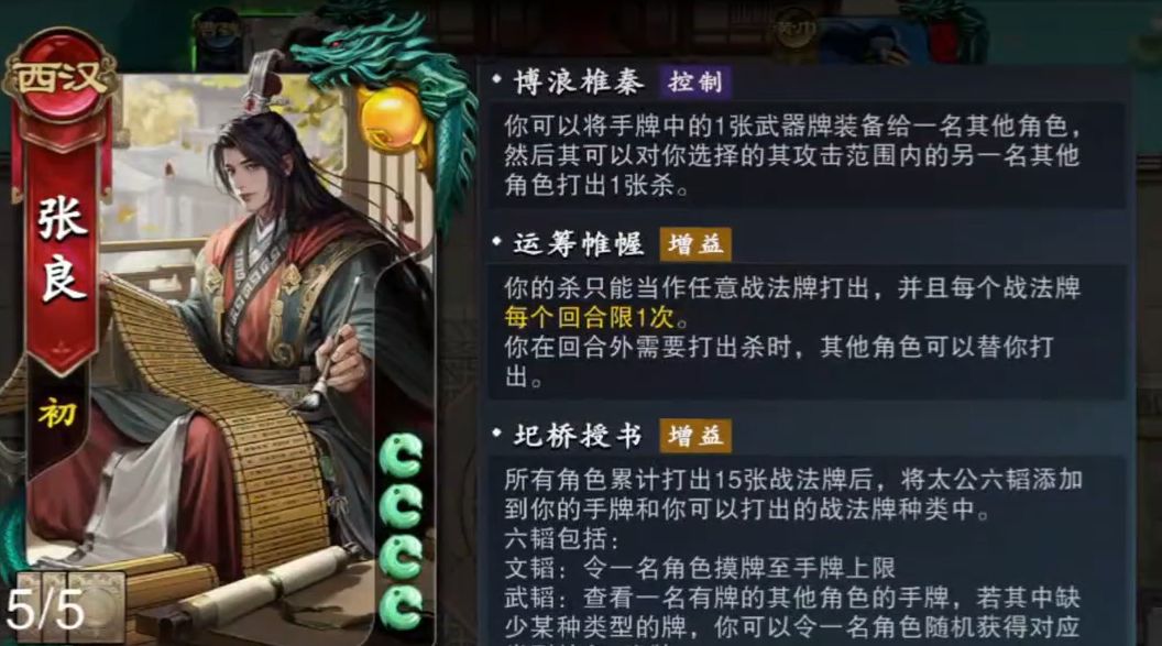 此外,一旦场上所有角色打出的战法牌累积到十五张后,张良还能获得圯桥授书技能,能获得六韬。其中龙韬的效果是可让自己指定的一名角色随机获得并装备一张装备牌,可配合孙尚香的枭姬娘娘使用,让张良能在一回合内通过使用龙韬和博浪椎秦为孙尚香装上两张装备牌。若是孙尚香手里没有装备牌,那在张良打出武韬牌后,还可为她补充装备牌作为手牌,令孙尚香在下一次行动回合时能进行爆发。