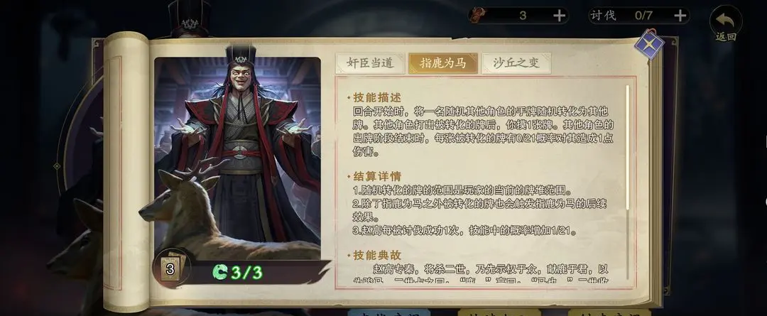 正式开启对赵高的讨伐以后,玩家一定要清楚的知道赵高的技能效果,赵高的一技能奸臣当道,每成功被逃犯了1次以后,赵高的初始体力、手牌上限都会分别加1,每被讨伐成功2次时,初始手牌会加1,每个回合出杀的次数以会加1次。