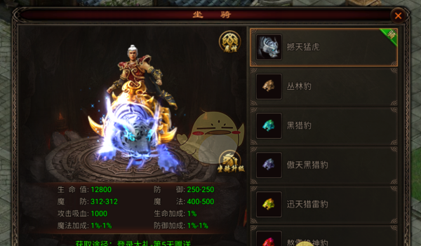 撼天猛虎(登录大礼-第5天赠送)、丛林豹(福利大厅-每日礼包获取)、黑猎豹(由丛林豹合成)、傲天黑猎豹(由黑猎豹合成)、迅天猎雷豹(由傲天黑猎豹合成)、熬雷绝神豹(由迅天猎雷豹合成)、邪影银月狼(由熬雷绝神豹合成)、赤影银月狼(由邪影银月狼合成)、血影银月狼(由赤影银月狼合成)