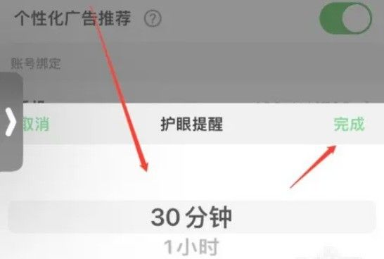 在展开菜单中选择护眼休息时间,点击【完成】即可