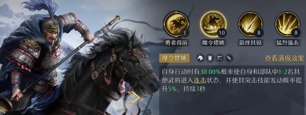 阵容的核心驱动者为张辽。在机制调整后,其被动效果可使周围1至2名友军获得连击状态,基础触发概率为30%;通过进阶操作,该概率提升5%,达35%;后续强化还可再提升10%,最高可达45%。需注意的是,此加成仅作用于连击类效果的触发判定,不涉及突击技能的发动概率,相关机制已在测试服反复验证。