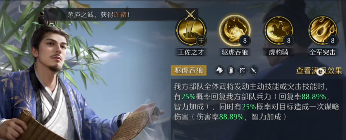 整套阵容的高频输出根基,源自荀彧的主动技能“驱虎吞狼”。该技能设定为:当己方任意武将释放主动技能或突击技能时,有固定概率触发效果——一方面恢复部队兵力,另一方面对目标追加一次谋略伤害。在张辽高频提供连击的前提下,“驱虎吞狼”的触发频次显著提升,从而形成“连击→触发→再连击→再触发”的正向循环,大幅提升单位时间内的总伤害量与续航韧性。