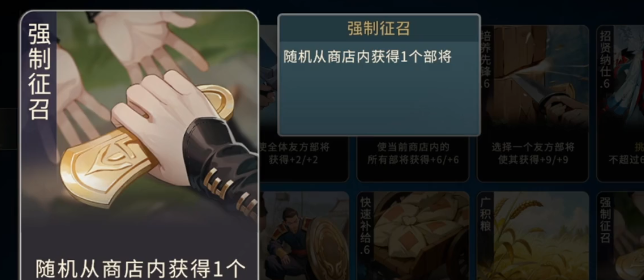 可以先从基础的资源来说,获取一枚金币,这就是前期过度的蚊子腿。不过在连胜局中,可以靠着慢慢的积累,还是比较有优势性的。全友方部将获得提升,这就是中期比较优势的存在,尤其是搭配群攻阵容,全员的属性抬手就可以直接碾压强攻队伍。商店内所有部将提升,这就比较适合于赌高费卡,在锁定商店刷核心时,就可以顺便把所有的属性叠加起来,成型之后,简直就是碾压级别的面板。