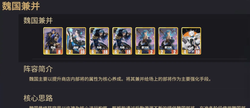核心的思路会比较清晰,需要把商店里面的部将直接当成养料,可以通过兼并的机制去有效强化场上的核心。这套阵容的终极核心就是许褚,他的技能在准备阶段,可以兼并魏国武将,直接就可以吸取对方身上的属性。养到最后,这就等同于是移动堡垒。在这一套阵容中,甄姬也是不可以错过的,通过后勤的技能就可以给商店一直刷魏国武将,让许诸成为一个不会缺兼并的目标。蔡文姬就可以迅速的提升商店内每一个部将的基础属性,所以每一次的兼并都会更有价值。